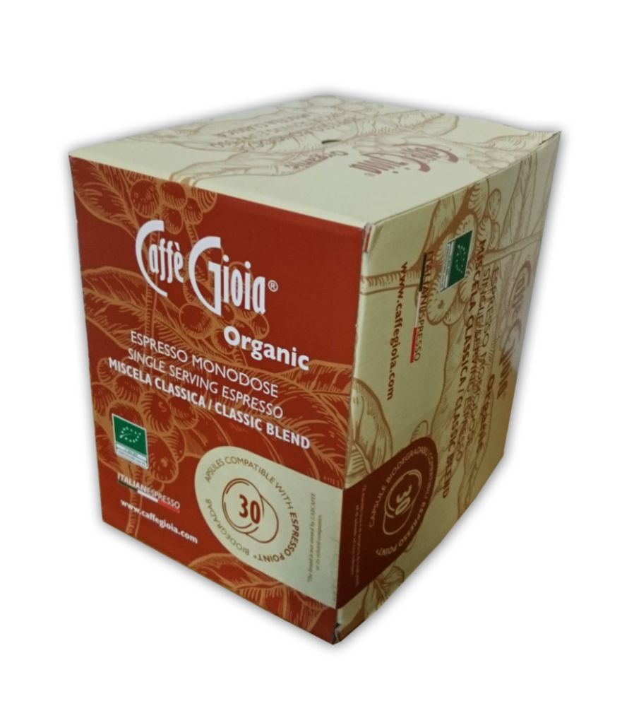 Suits Lavazza Point etc. Superior taste award! Our organic, fair-trade coffee from Caffé Gioia has been awarded. Capsule in biodegradable plastic. Suits very well with milk. The strong tast, gives a tastful Caffe Latte.